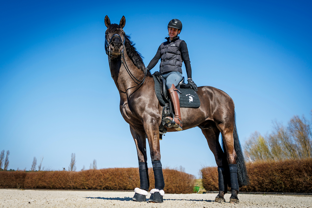 Who shines more? The powerful spring sun in the bright blue sky above Bonhomme Stud Farm, or Moritz Treffinger, 22, who will soon be able to add “World Cup finalist” to his Instagram bio? Hard to say. And there’s not much time to think about it. Cadeau Noir, who is currently being groomed by groom Gina and who draws attention to himself by scratching, makes sure that he plays a big part in Moritz Treffinger’s successes. After all, Moritz became U25 European Champion 2025 on the back of the stallion, and it was also the black stallion who carried him into the rankings in three out of five World Cup qualifiers.