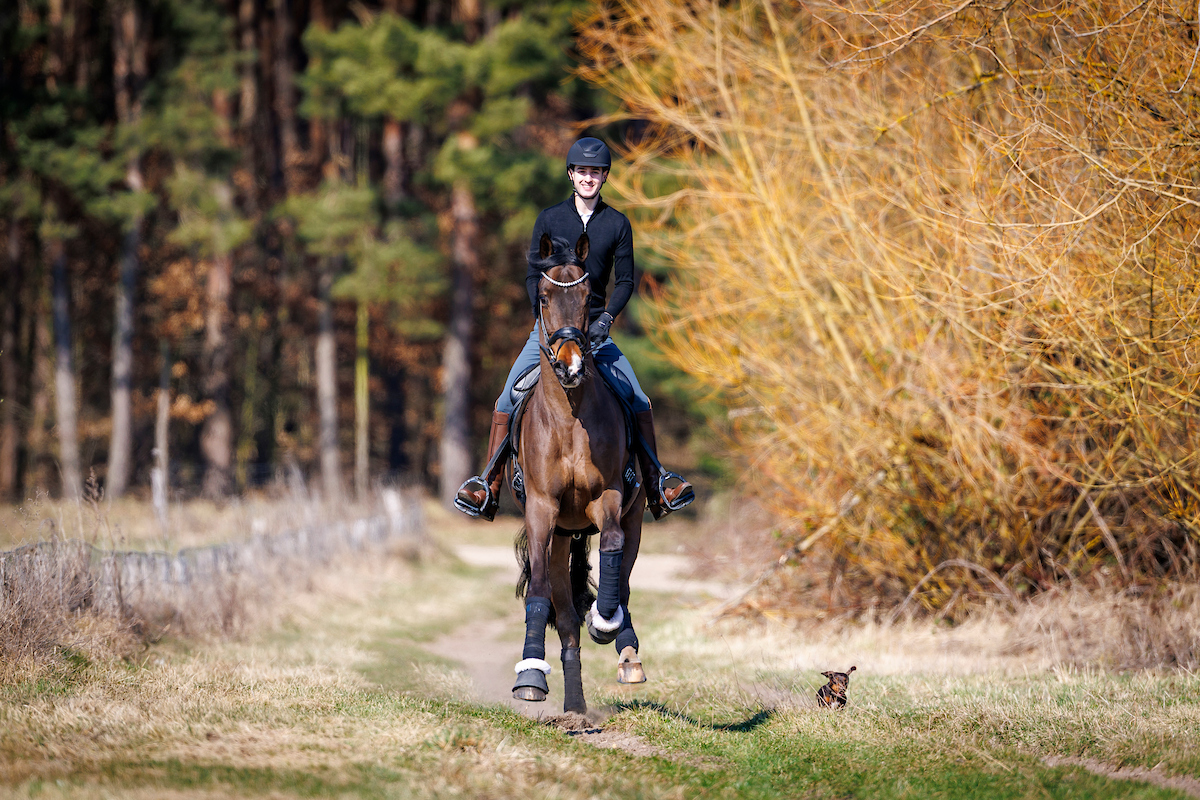 Moritz Treffinger and Cadeau Noir gallop around the racecourse at Bonhomme Stud. Dachshund Fridolin must not be missing! Photo: sportfotos-lafrentz.de / Stefan Lafrentz  Moritz Treffinger and Cadeau Noir gallop around the racecourse at Bonhomme Stud. Dachshund Fridolin must not be missing! Photo: sportfotos-lafrentz.de / Stefan Lafrentz