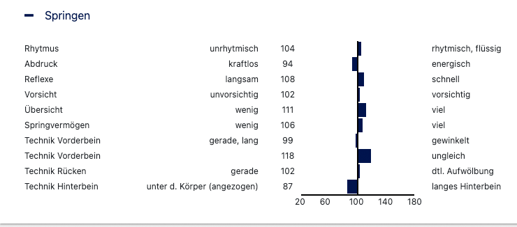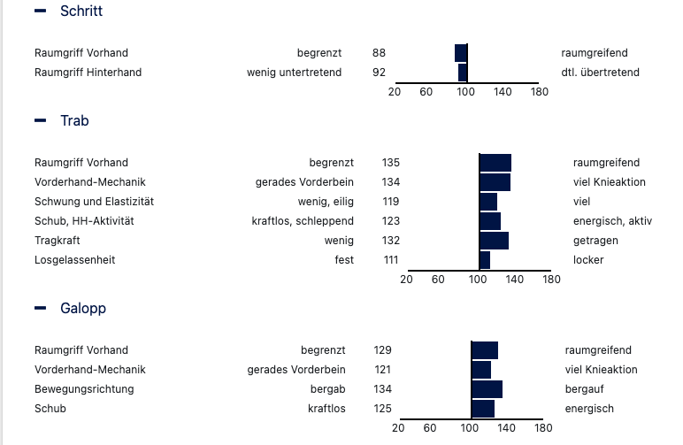 Der Clou ist die Kombination von Phänotypdaten (Turnierergebnisse, lineare Beschreibungen, …) mit den hochauflösenden genotypischen Informationen in Analysen, so dass abgesicherte Ergebnisse „verbraucherfreundlich“ verfügbar werden. So erscheint eine Diagramm-Abbildung, wie man sie aus der Darstellung der linearen Beschreibung kennt, allerdings mit einer anderen Skala. Dort steht die Null für eine mittlere Ausprägung, die  mit einer Bandbreite von -3 bis +3 von 0 ausgehend variiert. Bei den genomischen Zuchtwerten jedoch deutet die 100 im Zentrum darauf hin, dass die Genetik nicht in Richtung des einen oder anderen Extrems deutet.